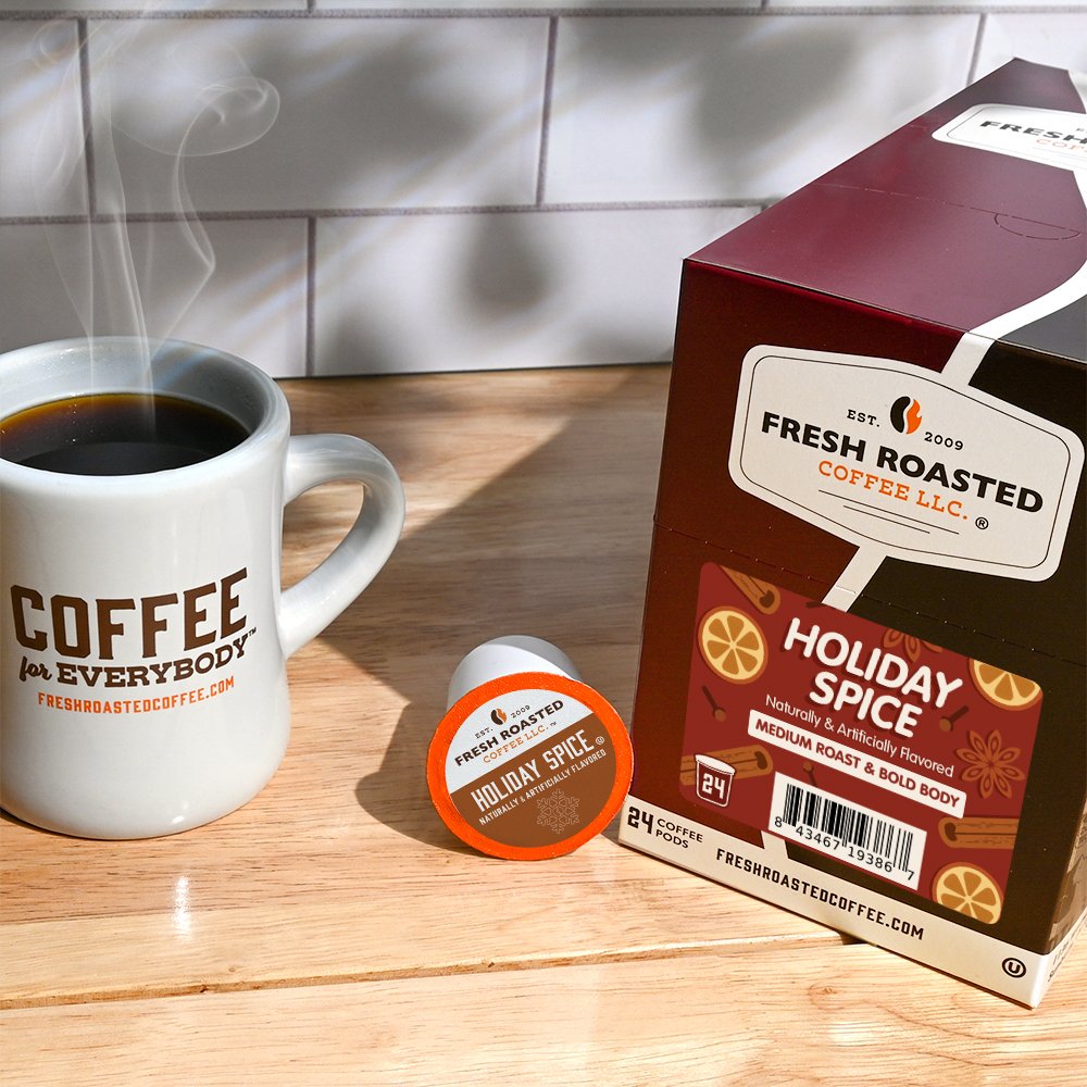 We've taken FRC to the next level of flavor - it's Fresh Roasted Flavored Coffee Pods! Each pod is packed with Fresh Roasted Coffee and our own holiday spice flavor - no sugar, no artifical sweeteners. And just like our traditional coffee pods, each one is nitrogen-flushed to maximize freshness.