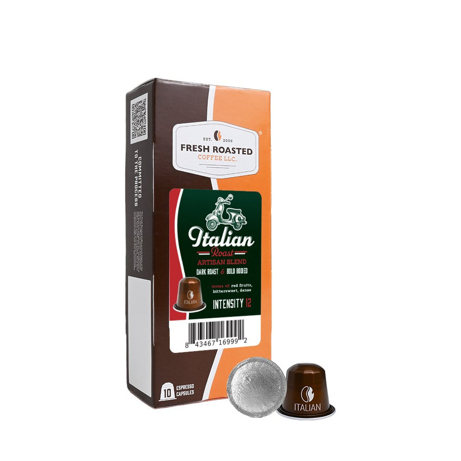Fresh Roasted Coffee LLC Verrocchio espresso coffee beans, 12 oz bag, highlighting bold notes of baked apple, dark chocolate, and peanut brittle with Intensity 9 Italian roast.