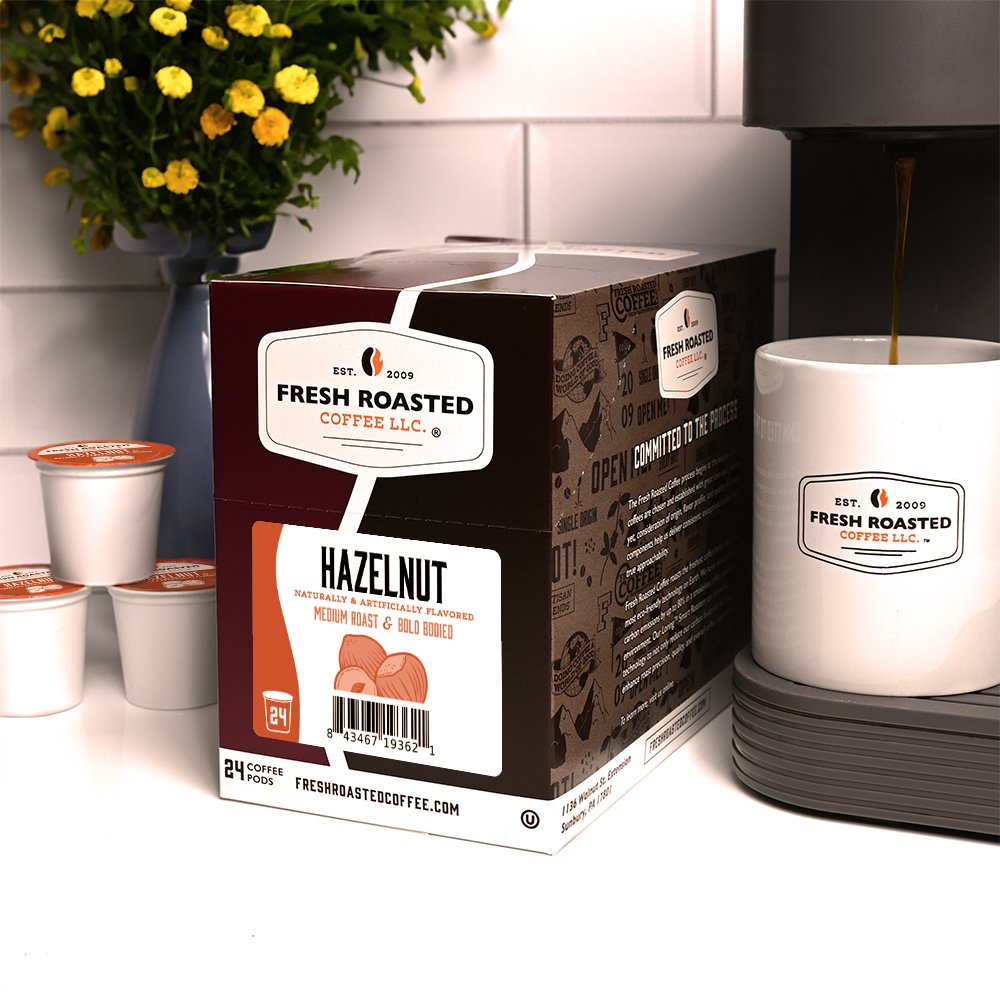 We've taken FRC to the next level of flavor - it's Fresh Roasted Flavored Coffee Pods! Each pod is packed with Fresh Roasted Coffee and our own hazelnut flavor - nothing else. And just like our traditional coffee pods, each one is nitrogen-flushed to maximize freshness.